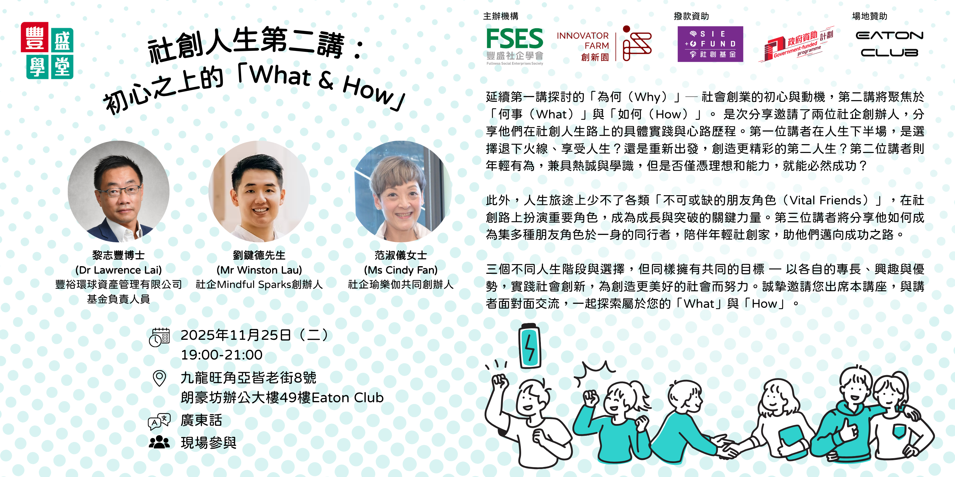 每月或兩個月一次的研討會及分享會,介紹社會創業相關的成功案例和經驗。從而接觸不同 界别的人,並且彼此結網,共組平台;同時希望給他們介紹社會創新、如何量度社會效益等的方法,讓更多人了解社創及回應社會